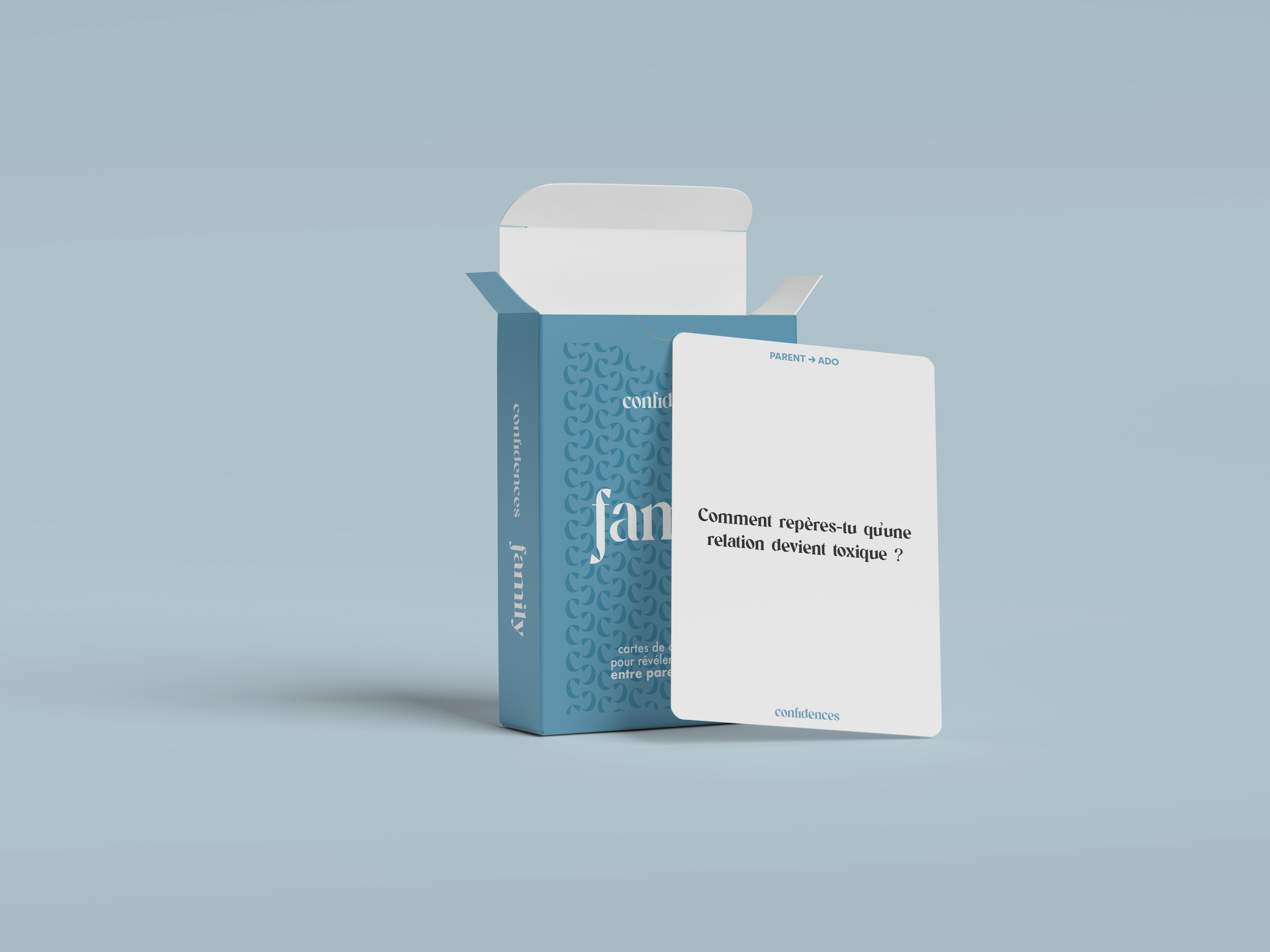 Entre parents et ados, la communication n’est pas toujours facile. Les malentendus s’accumulent, chacun reste dans son coin et le dialogue se perd. Family crée un espace d’échange neutre et bienveillant pour toute la famille. En répondant à des questions tantôt légères, tantôt sérieuses, parents et adolescents apprennent à se redécouvrir mutuellement. Les cartes permettent d’aborder des sujets qu’on n’ose pas évoquer d’habitude, de partager des souvenirs, des points de vue et des émotions dans un climat de confiance. Peu à peu, Family brise la glace générationnelle : il désamorce les conflits, fait tomber les préjugés, provoque des sourires complices et rétablit le dialogue familial en toute simplicité.